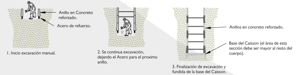 La excavación suele realizarse con diámetros variables según diseño, avanzando en secciones de 1 metro de profundidad. Los anillos perimetrales de concreto se construyen con espesores de aproximadamente 15 cm, reforzados con acero, hasta alcanzar las profundidades requeridas.