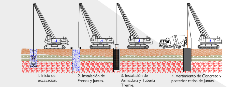 Son muros en concreto fundidos en sitio de sección transversal rectangular o variable, construidos con el objetivo de permitir excavaciones seguras en sótanos, taludes o infraestructuras viales y demás edificaciones. Además de contener la excavación, estos elementos permiten controlar filtraciones y escorrentías subterráneas.