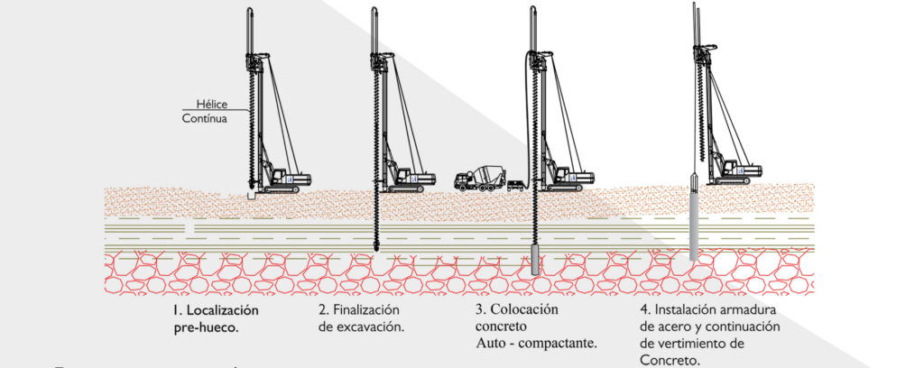 Es un sistema de pilotes fundidos in situ en la que se realiza de manera simultánea la perforación del suelo mediante un barreno sinfín, y el hormigonado ocurre por el interior de dicho tubo por un ducto central.