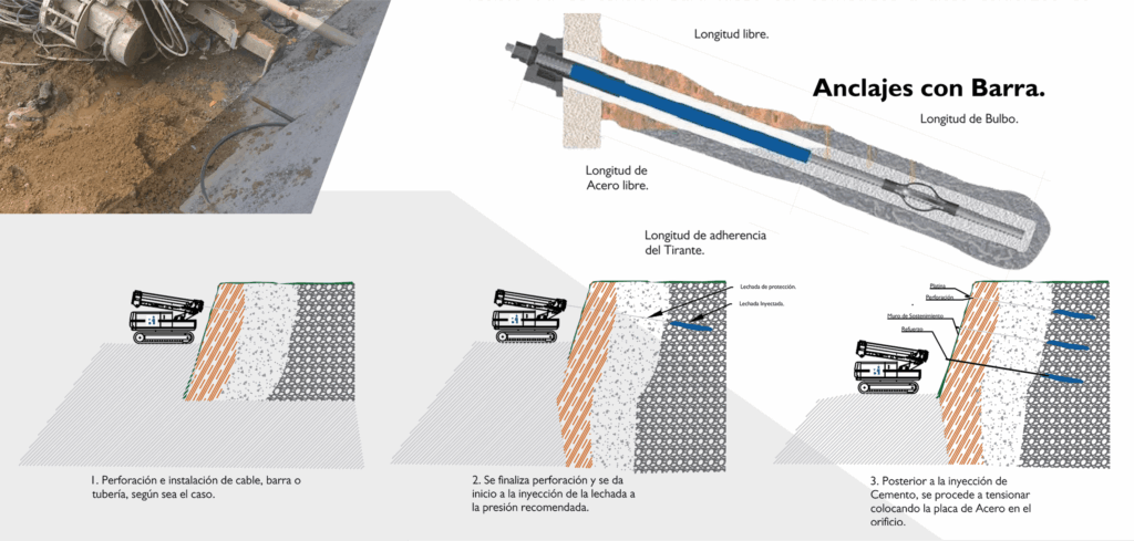 Estos sistemas permiten la sujeción y el refuerzo del terreno, aportando resistencia a esfuerzos de tracción y mejorando la seguridad de estructuras en áreas con riesgo de inestabilidad.