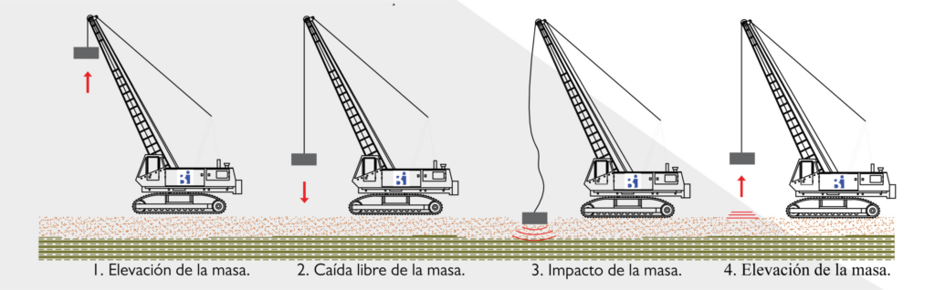 La compactación dinámica es una técnica empleada para mejorar la capacidad portante de suelos con baja resistencia, mediante la aplicación de esfuerzos dinámicos en superficie. El procedimiento consiste en dejar caer repetidamente una masa pesada desde una altura determinada, generando ondas de esfuerzo que mejoran las características del terreno.